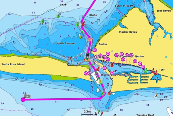 To give a clear picture of shallow waters to avoid, this feature allows for shading at a user-defined depth.