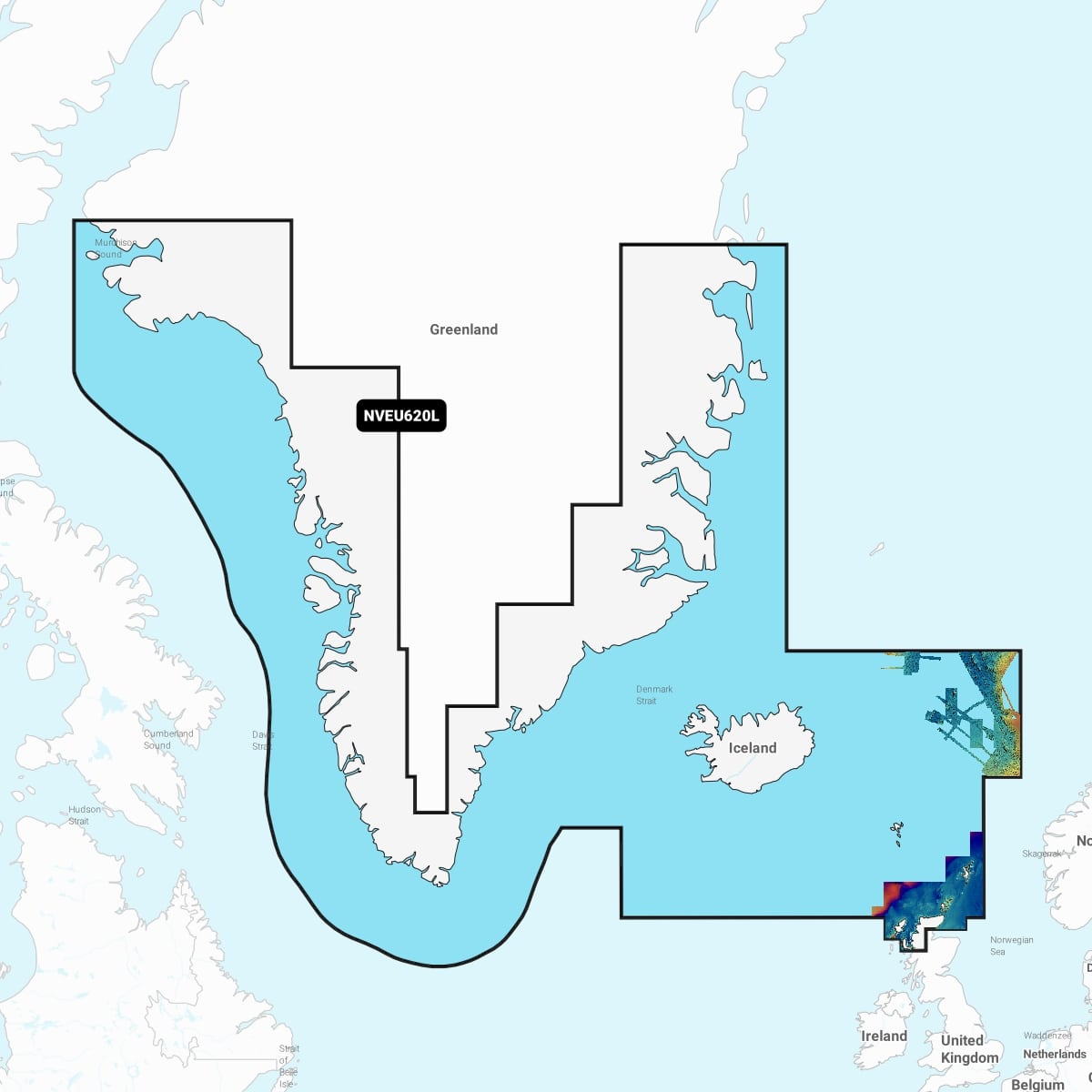 Detailed coverage of Greenland, Iceland, the Faeroe Islands, the Shetland Islands, the Orkney Islands and the northern tip of Britain. Coverage includes Godhavn (Qeqertarsuaq) and Godthab (Nuuk), Greenland; Reykjavik and Akureyri, Iceland; Torshavn, Lerwick, Stromness, Kirkwall and Thurso, United Kingdom.