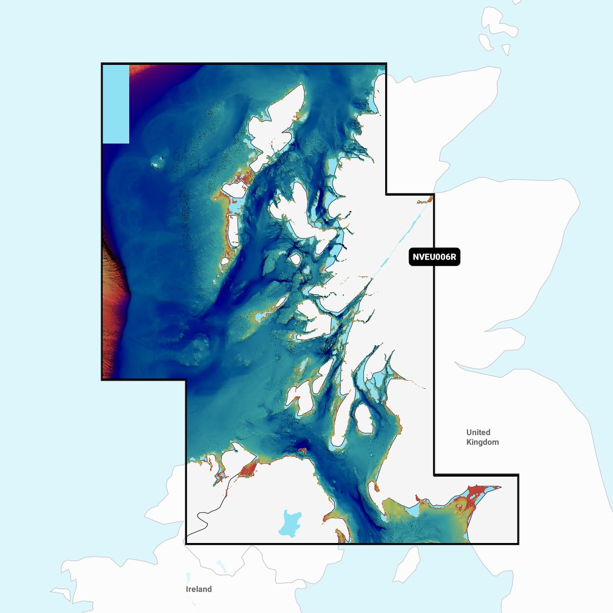Coastal coverage of the western coast of Scotland from Cape Wrath to Solway Firth including the Isles of Lewis, Skye, Mull, Islay and many others. Also included is coverage of Northern Ireland from Londonderry to Belfast and Lough Neagh.